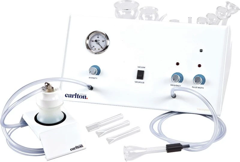 Vacupulse is a complete, regulated air system incorporating a constant vacuum suction and an infinitely variable pulsating action. This unit enables both the frequency and the pulse width to be individually adjusted, allowing the therapist to carry out a vast range of treatments. Suitable for face and body.