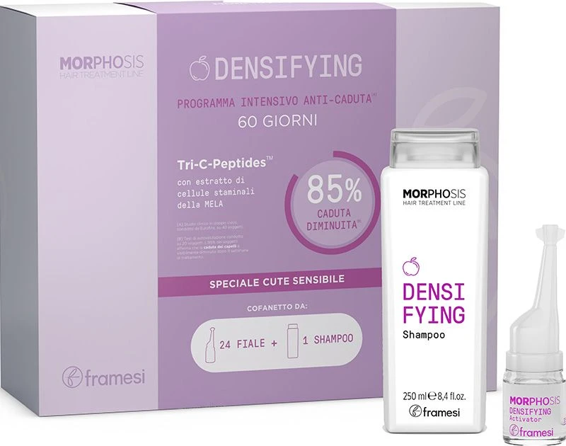 Containing a densifying shampoo and vials of densifying activator, this kit contains everything you need for the Framesi Densifying Anti-Hair Loss Ritual.