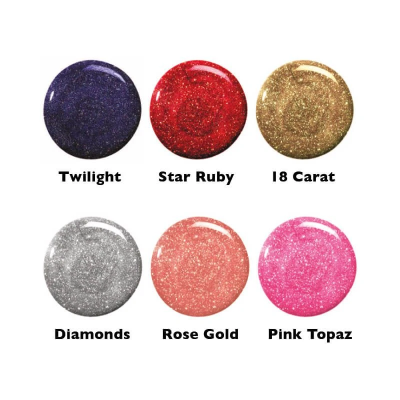 This collection includes glitter shades: Twilight, Star Ruby, 18 Carat, Diamonds, Rose Gold and Pink Topaz.