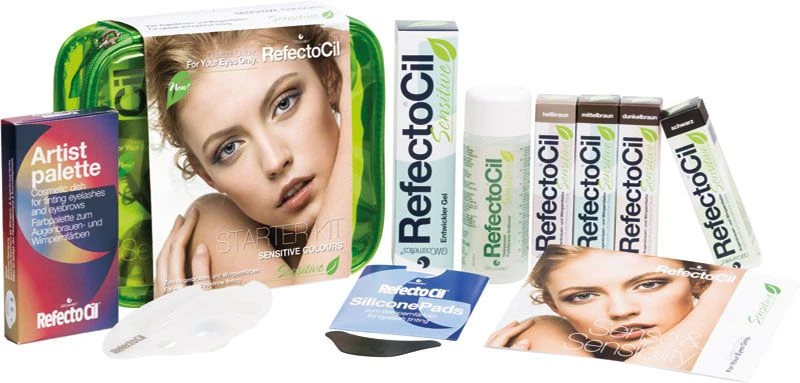 Contents: RefectoCil Sensitive Tint 15ml x 4 (Black, Dark Brown, Mid Brown, Light Brown), Sensitive Developer Gel 60ml, Sensitive Tint Remover 100ml, Silicone Pads (2), Artist Palette and Plastic Case.